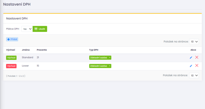 V modulu DPH máte možnost založit i další typy DPH, ale pouze ve třech sazbách: Základní sazba (Standard), Snížená sazba 1 a Snížená sazba 2 (Lower). V roce 2024 byly zjednodušeny sazby na pouze dvě místo tří, jednu tedy lze využít jako rezervu pro jiné státy. Novou sazbu DPH lze založit pomocí tlačítka Přidat.