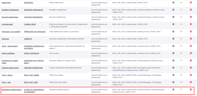 E-mailové šablony můžete editovat v modulu E-mailové šablony, který najdete v levém menu administrace pod sekcí Nastavení e-shopu/E-mailové šablony, nebo můžete šablony vyhledat přes interní vyhledávač e-shopu.