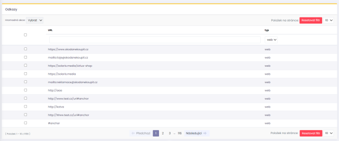 Vyhledávat odkazy můžete prostřednictvím filtru v políčku URL.